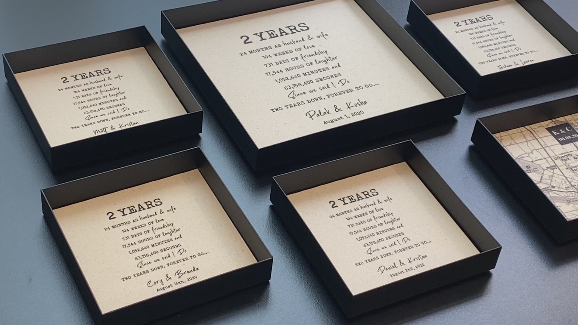We take great care in tastefully packaging your gifts using Eco-Friendly materials. For anniversary gifts, we include a thoughtful note that explains the significance of the year and the meaning behind the material chosen to symbolize it.